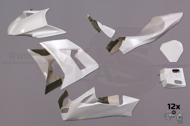 Kompletny zestaw zawiera: 1x część górna, 1x część boczna „+ P”, 1x część dolna, 1x część tylna Darmowy zestaw szybko zwalniających zacisków i żaroodpornej folii z korkiem spustowym do dolnej części. Zastosowany materiał: GRP - włókno szklane FLEXI w kolorze białym RAL 9003 + 3 x wzmocnienia KK (Kevlar-Carbon) w punkcie mocowania Odporność termiczna zastosowanego materiału wynosi 100 ° C. Włókno szklane ma standardowy biały kolor RAL 9003 w materiale podstawowym GFK i jest odporne na promieniowanie UV, więc nie ma potrzeby malowania. Otwory do zamocowania owiewki nie są wstępnie nawiercone, ale oczywiście można zamówić wiercenie i profesjonalną instalację szybkozłączek do owiewki. Żaroodporna folia chroni okapy przed ciepłem z rury wydechowej i mot Korek spustowy zapewnia spuszczanie płynów z dołu w celu umycia motocykla.