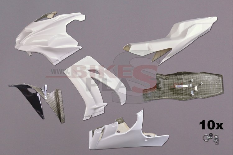Kompletny zestaw zawiera: 1x część górna, 1x część boczna „+ P”, 1x część dolna, 1x część tylna Darmowy zestaw szybko zwalniających zacisków i żaroodpornej folii z korkiem spustowym do dolnej części. Zastosowany materiał: GRP - włókno szklane FLEXI w kolorze białym RAL 9003 + 3 x wzmocnienia KK (Kevlar-Carbon) w punkcie mocowania Odporność termiczna zastosowanego materiału wynosi 100 ° C. Włókno szklane ma standardowy biały kolor RAL 9003 w materiale podstawowym GFK i jest odporne na promieniowanie UV, więc nie ma potrzeby malowania. Otwory do zamocowania owiewki nie są wstępnie nawiercone, ale oczywiście można zamówić wiercenie i profesjonalną instalację szybkozłączek do owiewki. Żaroodporna folia chroni okapy przed ciepłem z rury wydechowej i mot Korek spustowy zapewnia spuszczanie płynów z dołu w celu umycia motocykla.