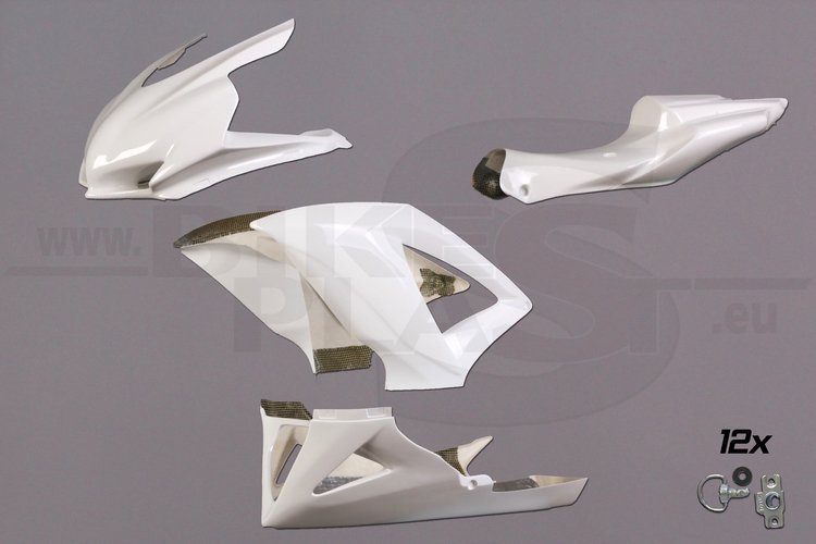 Kompletny zestaw zawiera: 1x część górna, 1x część boczna „+ P”, 1x część dolna, 1x część tylna Darmowy zestaw szybko zwalniających zacisków i żaroodpornej folii z korkiem spustowym do dolnej części. Zastosowany materiał: GRP - włókno szklane FLEXI w kolorze białym RAL 9003 + 3 x wzmocnienia KK (Kevlar-Carbon) w punkcie mocowania Odporność termiczna zastosowanego materiału wynosi 100 ° C. Włókno szklane ma standardowy biały kolor RAL 9003 w materiale podstawowym GFK i jest odporne na promieniowanie UV, więc nie ma potrzeby malowania. Otwory do zamocowania owiewki nie są wstępnie nawiercone, ale oczywiście można zamówić wiercenie i profesjonalną instalację szybkozłączek do owiewki. Żaroodporna folia chroni okapy przed ciepłem z rury wydechowej i mot Korek spustowy zapewnia spuszczanie płynów z dołu w celu umycia motocykla.