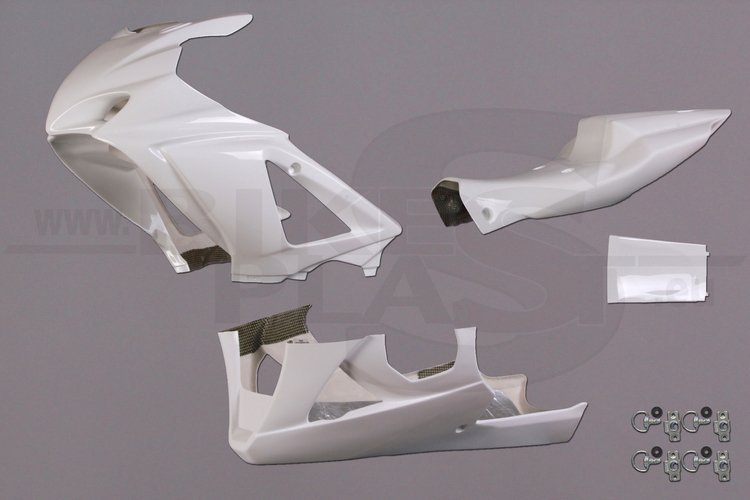 Kompletny zestaw zawiera: 1x część górna, 1x część boczna „+ P”, 1x część dolna, 1x część tylna Darmowy zestaw szybko zwalniających zacisków i żaroodpornej folii z korkiem spustowym do dolnej części. Zastosowany materiał: GRP - włókno szklane FLEXI w kolorze białym RAL 9003 + 3 x wzmocnienia KK (Kevlar-Carbon) w punkcie mocowania Odporność termiczna zastosowanego materiału wynosi 100 ° C. Włókno szklane ma standardowy biały kolor RAL 9003 w materiale podstawowym GFK i jest odporne na promieniowanie UV, więc nie ma potrzeby malowania. Otwory do zamocowania owiewki nie są wstępnie nawiercone, ale oczywiście można zamówić wiercenie i profesjonalną instalację szybkozłączek do owiewki. Żaroodporna folia chroni okapy przed ciepłem z rury wydechowej i mot Korek spustowy zapewnia spuszczanie płynów z dołu w celu umycia motocykla.