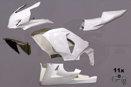 Kompletny zestaw zawiera: 1x część górna, 1x część boczna „+ P”, 1x część dolna, 1x część tylna Darmowy zestaw szybko zwalniających zacisków i żaroodpornej folii z korkiem spustowym do dolnej części. Zastosowany materiał: GRP - włókno szklane FLEXI w kolorze białym RAL 9003 + 3 x wzmocnienia KK (Kevlar-Carbon) w punkcie mocowania Odporność termiczna zastosowanego materiału wynosi 100 ° C. Włókno szklane ma standardowy biały kolor RAL 9003 w materiale podstawowym GFK i jest odporne na promieniowanie UV, więc nie ma potrzeby malowania. Otwory do zamocowania owiewki nie są wstępnie nawiercone, ale oczywiście można zamówić wiercenie i profesjonalną instalację szybkozłączek do owiewki. Żaroodporna folia chroni okapy przed ciepłem z rury wydechowej i mot Korek spustowy zapewnia spuszczanie płynów z dołu w celu umycia motocykla.