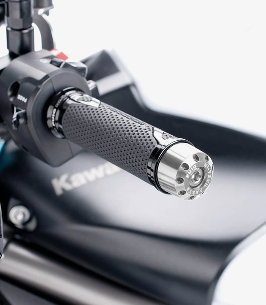 Ilustracja poglądowa. Fotografia prezentuje wygląd końcówek od strony zewnętrznej. Konkretne modele mogą się różnić mocowaniem (długość, rozmiar śruby, sposób wkręcania w kierownicę) - zawsze jest ono odpowiednie do motocykla.