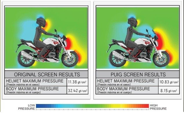 Łączne ciśnienie rozproszone przez szybę PUIG jest równoważne 4,74 kg. Test przeprowadzony w wirtualnym tunelu aerodynamicznym PUIG. Środowisko testowe: prędkość 120 km/h, wzrost kierowcy 180 cm, pozycja standardowa, temperatura 20 stopni C, bez wiatru. Schemat znajduje się w galerii przedmiotu.