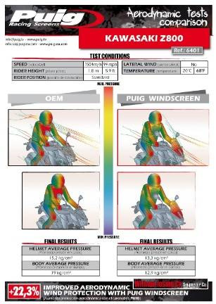 Poprawia ochronę przed wiatrem na motocyklu o 22,3% - bez straty aerodynamiki (współczynnika cX), poprzez zmniejszenie siły działającej na kask z 15,2 kg/cm2 do 13,3 kg/cm2 oraz siły działającej na ciało kierowcy z 19,0 kg/cm2 do 12,9 kg/cm2.