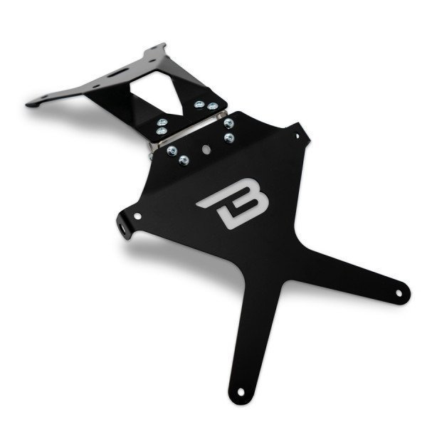 Wysokiej klasy mocowanie tablicy rejestracyjnej wykonane z aluminium anodowanego na kolor czarny posiada regulację pochylenia ze stali inox. W zestawie otrzymujesz wszystkie śruby oraz podkładki. Gotowy element do zamontowania, bez przeróbek oryginalnych części motocykla.