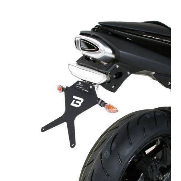 Wysokiej klasy mocowanie tablicy rejestracyjnej wykonane z aluminium anodowanego na kolor czarny posiada regulację pochylenia ze stali inox. Gotowy element do zamontowania, bez przeróbek oryginalnych części motocykla.