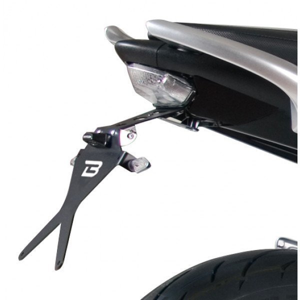 Wysokiej klasy mocowanie tablicy rejestracyjnej wykonane z aluminium anodowanego na kolor czarny posiada regulację pochylenia ze stali inox. Gotowy element do zamontowania, bez przeróbek oryginalnych części motocykla.