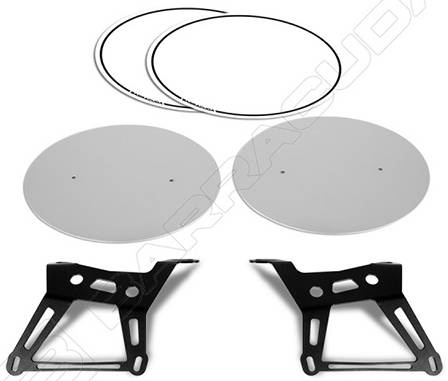 BARRACUDA - zestaw bocznych tablic numerowych wraz z mocowaniami na lewą oraz prawą stronę. Tablice wykonane są z aluminium, posiadają białą wyklejoną folię. Mocowania / wsporniki ze stali lakierowane proszkowo na kolor czarny. W komplecie zestaw montażowy.