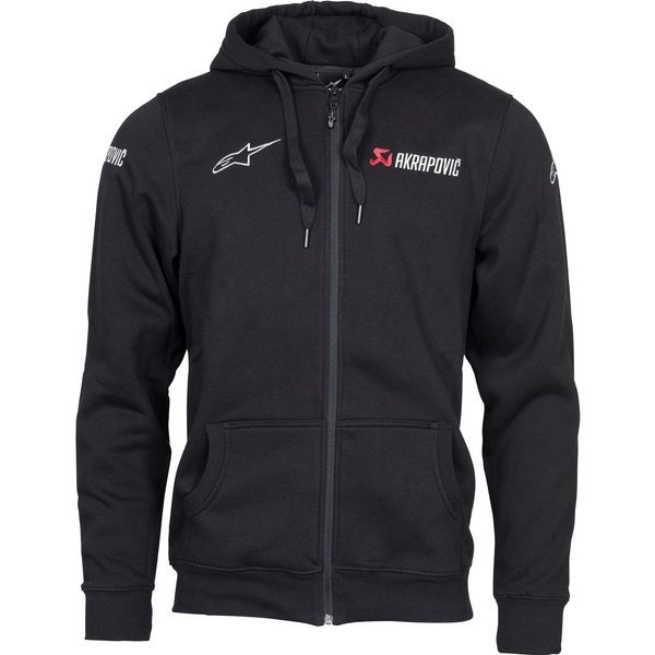 Bluza z kapturem i suwakiem z przodu z haftowanym logo Akrapovič i Alpinestars z przodu i dużym logo Akrapovič z tyłu.