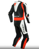 Jednoczęściowy kombinezon ze skóry bydlęcej licowej z perforacją, aluminiowymi płytkami naramiennymi i aerodynamicznym garbem, który może pomieścić zestaw worków wodnych. Ikona wyścigów Dainese.