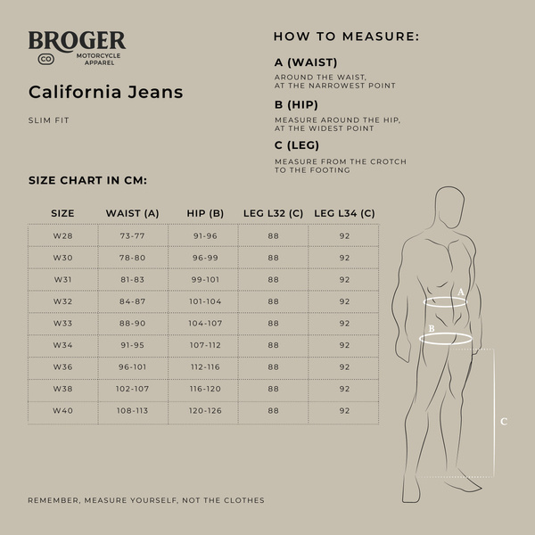 Jeansy motocyklowe Broger California są dopasowane do sylwetki i posiadają zwężone nogawki. Ich krój to slim fit, a dzięki całkowicie wypinanej warstwie wewnętrznej w mgnieniu oka staną się zwykłymi, casualowymi jeansami. Zostały stworzone przez motocyklistów dla motocyklistów, są wyjątkowo wygodne i praktyczne, a cała marka jest inspirowana kulturą Stanów Zjednoczonych.