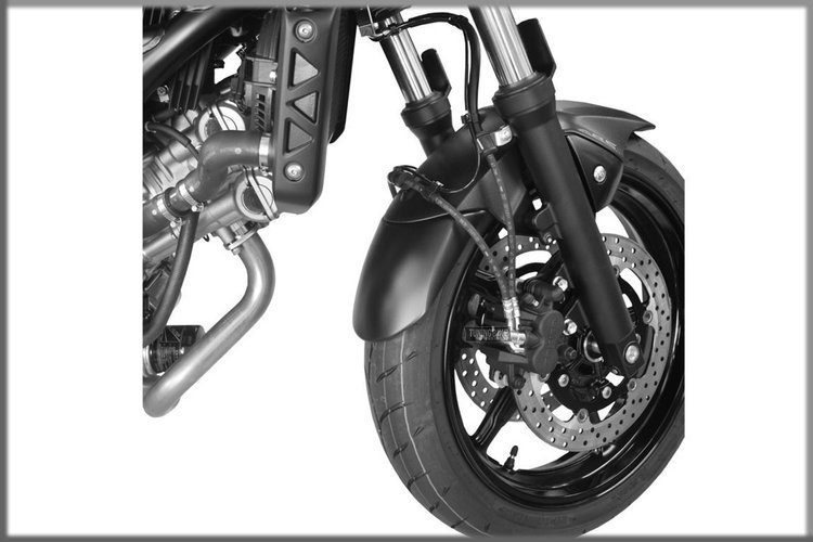Przedłużenie przedniego błotnika zapewnia ochronę dolnej części motocykla - kolektorów układu wydechowego, owiewek i innych elementów - przed zabrudzeniami z przedniej opony.