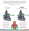 Test przeprowadzony w wirtualnym tunelu aerodynamicznym PUIG. Środowisko testowe: prędkość 150 km/h, wzrost kierowcy 180 cm, pozycja standardowa, temperatura 20 stopni C, bez wiatru. Schemat znajduje się w galerii przedmiotu.