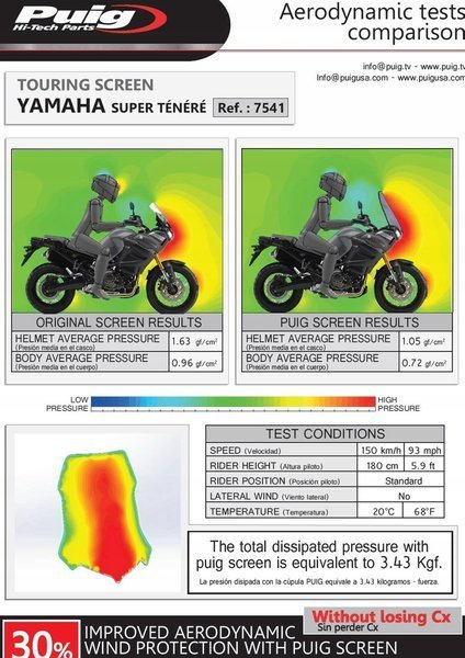 Poprawia ochronę przed wiatrem na motocyklu o 30,0% - bez straty aerodynamiki (współczynnika cX), poprzez zmniejszenie siły działającej na kask z 1,63 gf/cm2 do 1,05 gf/cm2 oraz siły działającej na ciało kierowcy z 0,96 gf/cm2 do 0,72 gf/cm2. Szyba PUIG rozbija ciśnienie równe 3,43 Kgf!