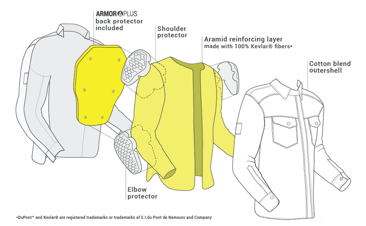 Bezpieczne szwy i podszewka z włókna aramidowego na całej powierzchni koszuli zapewniają odporność na rozdarcia i przetarcia. Regularne, luźne dopasowanie nie krępuje ruchów i zapewnia poczucie komfortu, a specjalne zakładki na plecach pozwalają zgrabnie dopasować koszulę do sylwetki. Wszystko zaprojektowane w taki sposób, aby nie zaburzać ergonomii podczas jazdy.