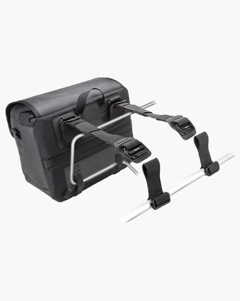 Paski mocujące zawarte w zestawie do pojedynczej lub podwójnej torby, a także regulowany pasek na ramię do przenoszenia torby po zejściu z motocykla.