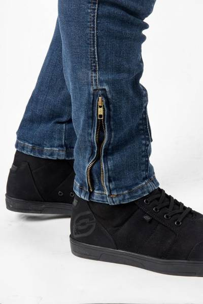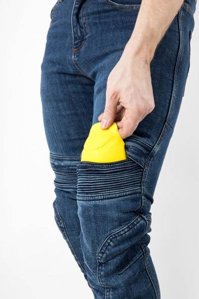 Motocyklowe spodnie jeansowe Hornet mają wyjmowane ochraniacze kolan CE Level 2. Kieszenie na biodrach umożliwiają dołożenie ochraniaczy. Elastyczne wstawki nad kolanami dają swobodę ruchów. Długie zamki umożliwiają łatwe wkładanie i zdejmowanie spodni. Spodni uszyte w kroju slim. MATERIAŁ