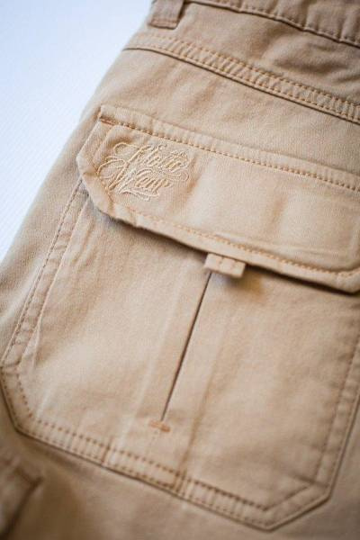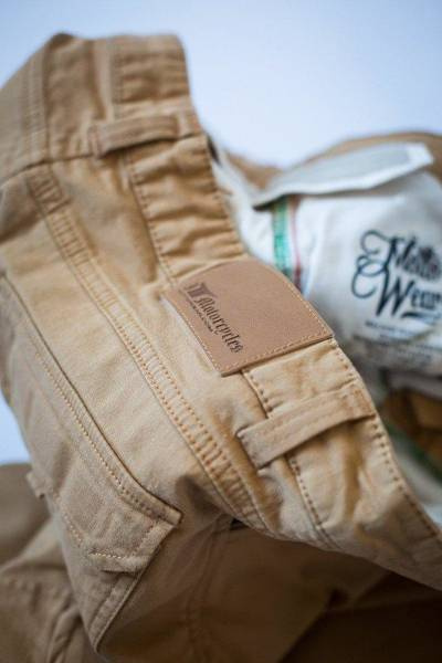 Kolana, biodra, zewnętrzna strona ud i tyłek podszyte są miękkim, odpornym na ścieranie materiałem 100% Kevlar®. Na kolanach znajduje się wyjmowany i regulowany protektor SAS-TEC®.