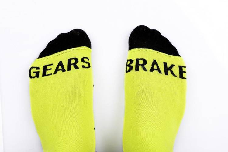 Podczas tworzenia skarpetek przyświecała nam idea rozwiązania odwiecznego problemu. Na prawej skarpetce umieściliśmy napis "brake", a na lewej "gears" ;)