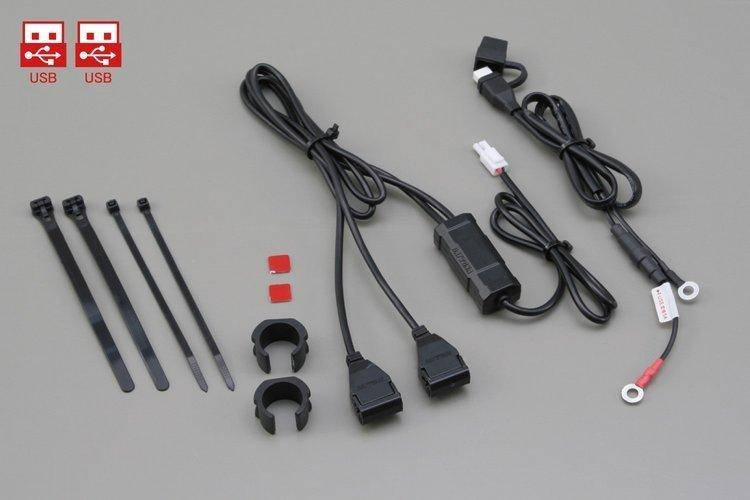 Źródła zasilania z 2 portami USB na przewodach do montażu na kierownicy motocykla.