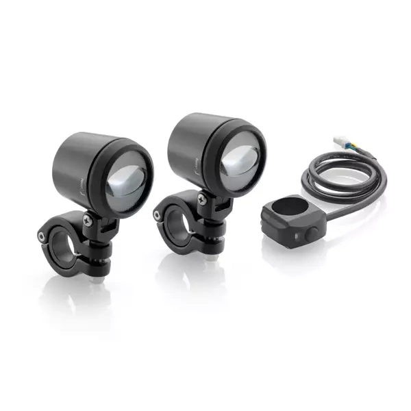 The most memorable long-distance rides demand maximum safety: LED fog light kit with aluminum cover. The Kit includes 25.4 - 30 mm diameter mounting clamps and brackets.