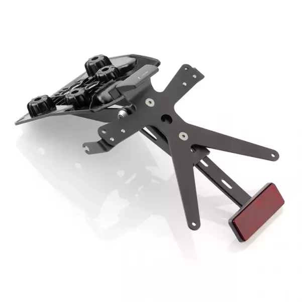 Made from aluminum, each Fox license plate kit is specifically designed for a corresponding motorcycle model. This means it matches the motorcycle styling perfectly and is quick and easy to install. Each kit actually includes everything required to fit it without requiring any modifications to OEM parts. Great functionality plus maximum compactness, but always in complete compliance with legal requirements. Fox kits include an SMD LED license plate light, reflector and Rizoma turn signal supports. They are adjustable and supplied with a safety lock to ensure the correct tilt.