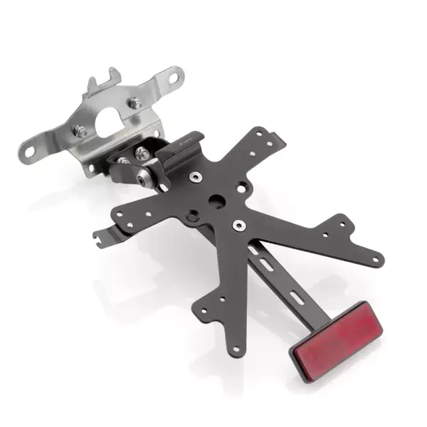 Made from aluminum, each Fox license plate kit is specifically designed for a corresponding motorcycle model. This means it matches the motorcycle styling perfectly and is quick and easy to install. Each kit actually includes everything required to fit it without requiring any modifications to OEM parts. Great functionality plus maximum compactness, but always in complete compliance with legal requirements. Fox kits include an SMD LED license plate light, reflector and Rizoma turn signal supports. They are adjustable and supplied with a safety lock to ensure the correct tilt.