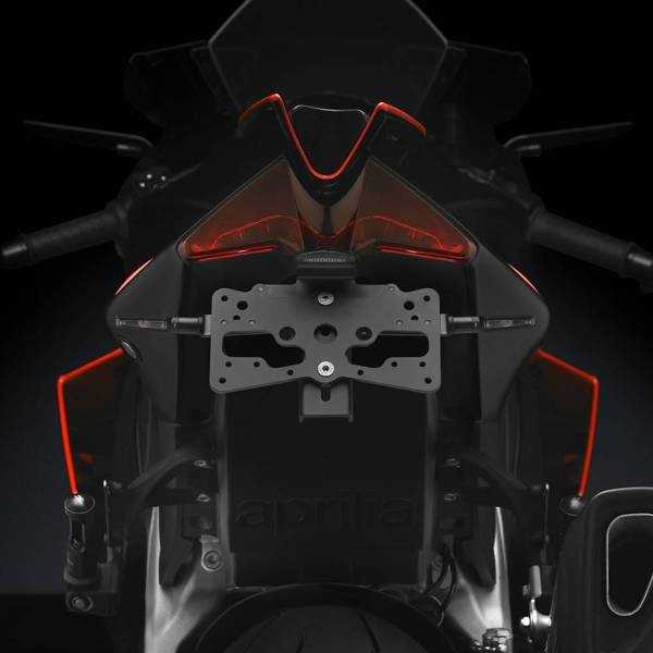 Rizoma PTS license plate supports are compatible with small plates only (such as USA plate 166x89.5 mm), as they have been developed with a shorter support. By mounting a bigger plate, when the rear shock is at the stroke end, the plate could impact the rear wheel producing damages to the motorcycle and representing a danger to the rider.