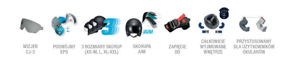 Skorupa kasku z materiału AIM. Wypełnienie EPS o zróżnicowanej gęstości. Wizjer SHOEI CJ-3 działający w 3 płaszczyznach w celu lepszego dopasowania. Zapięcie typu DD