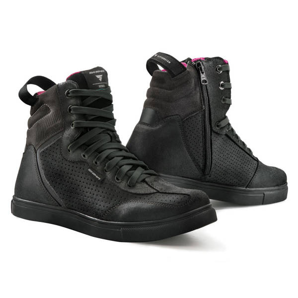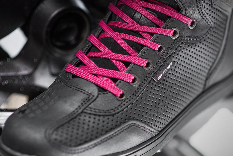 Wodoodporne trampki REBEL WP Lady to połączenie bezpieczeństwa i miejskiego stylu. Ich ergonomiczna gumowa podeszwa została poprzecznie wzmocniona. Dodatkowo wzmocnione pięty, palce i kostki gwarantują wysoki poziom bezpieczeństwa. Buty zostały również wyposażone w protektor kostki SAP wykonany z TPU - dla lepszej stabilności i pewności ruchów. Wykonane ze skóry naturalnej buty posiadają perforowane przestrzenie dla kontroli cyrkulacji powietrza. Mikroporowata membrana wodoodporna NextDry utrzyma Twoje stopy suche - nawet w deszczowe dni. Dla dostarczenia najwyższego standardu komfortu trampki zostały wyposażone w pasek do naciągania i zamek błyskawiczny z boku, dzięki czemu można je sprawnie założyć lub zdjąć. Przetłoczenia na noskach ułatwiają obsługę dźwigni zmiany biegów dzięki antypoślizgowym właściwościom, a specjalna pochylona konstrukcja imituje pozycję stóp podczas jazdy motocyklem. Inspirowane stylem ulicznym będą odpowiednie również po zejściu z motocykla. Trampki REBEL WP Lady zaprojektowano z uwzględnieniem kobiecego dopasowania i wyposażono w dwie wersje kolorystyczne sznurowadeł (oba dostępne w zestawie), dzięki czemu możesz wybrać swój styl w zależności od potrzeb.
