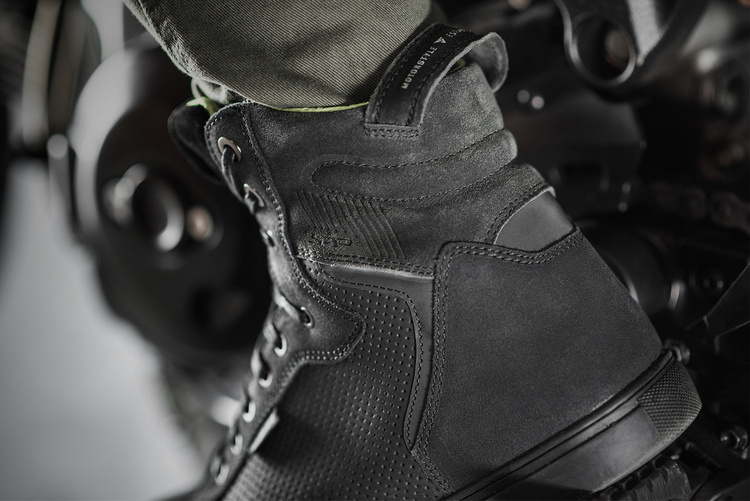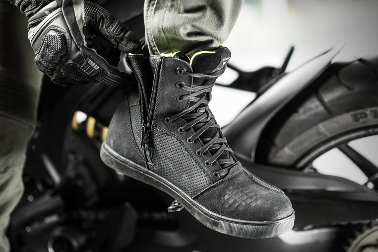 Wodoodporne trampki REBEL WP to połączenie bezpieczeństwa i miejskiego stylu. Ich ergonomiczna gumowa podeszwa została poprzecznie wzmocniona. Dodatkowo wzmocniono także pięty, palce i kostki. Gwarantują one wysoki poziom bezpieczeństwa. Buty zostały również wyposażone w protektor kostki SAP wykonany z TPU - dla lepszej stabilności i pewności ruchów. Wykonane ze skóry naturalnej trampki posiadają perforowane przestrzenie dla kontroli cyrkulacji powietrza. Mikroporowata membrana wodoodporna NextDry utrzyma Twoje stopy suche nawet w deszczowe dni. Dla dostarczenia najwyższego standardu komfortu trampki zostały wyposażone w pasek do naciągania i zamek błyskawiczny z boku, dzięki czemu można je sprawnie założyć lub zdjąć. Przetłoczenia na noskach ułatwiają obsługę dźwigni zmiany biegów dzięki antypoślizgowym właściwościom, a specjalna pochylona konstrukcja imituje pozycję stóp podczas jazdy motocyklem. Inspirowane stylem ulicznym będą odpowiednie również po zejściu z motocykla. Trampki REBEL WP wyposażono w dwie wersje kolorystyczne sznurowadeł (oba dostępne w zestawie), dzięki czemu możesz wybrać swój styl w zależności od potrzeb.