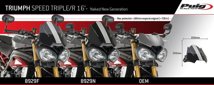 • Triumph SPEED TRIPLE 1050 R 2016-2017, Triumph SPEED TRIPLE 1050 RS 2018-2020, Triumph SPEED TRIPLE 1050 S 2016-2020, Triumph STREET TRIPLE 765 R 2017-2020, Triumph STREET TRIPLE 765 RS 2017-2019, Triumph STREET TRIPLE 765 S 2018-2021