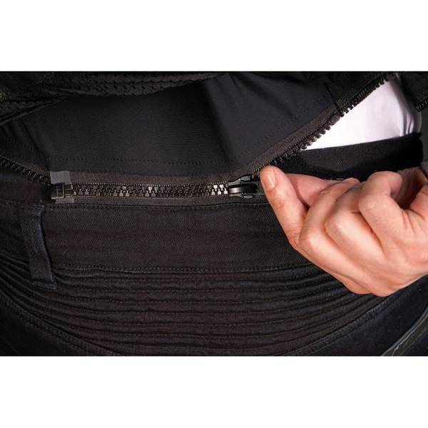 Mała sztuczka to wentylacja, która jest sprytnie umieszczona na udach, tuż obok bocznych kieszeni. Ponadto, lokalizacja wentylacji na górnej części uda eliminuje ryzyko zranienia z zamka przy ewentualnym upadku motocyklisty. Ze względów bezpieczeństwa wentylacja jest pokryta płótnem z kevlaru.