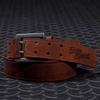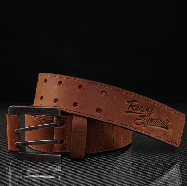 Skórzany pasek z metalową sprzączką w stylu Gun Metal z wypalonym logo Racing Syndicate.