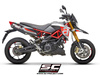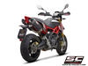 SC1-M, wywodzący się z kultowego tłumika SC1. Nowy SC1-M został opracowany przez dział badawczo-rozwojowy dla motocykli o średniej mocy. Krótka, kompaktowa i nowoczesna dla tych, którzy preferują minimalistyczne kształty. Nowa zaślepka z włókna węglowego Twill o zdecydowanym i mocnym charakterze dobrze dopasowuje się do kształtów Aprilia Dorsoduro 900. Metalowa część sekcji wyjściowej została zaprojektowana tak, aby lepiej współgrała ze sportowym designem zaślepki z włókna węglowego. Tłumik jest wyposażony w DB-killer i jego specyficzny system bloków. Tłumik posiada homologację EURO 4. Część zewnętrzna może być dostarczona zarówno w wersji Titanium, jak i Carbon. Zacisk mocujący do podwozia jest wykonany z malowanej stali nierdzewnej AISI 304.