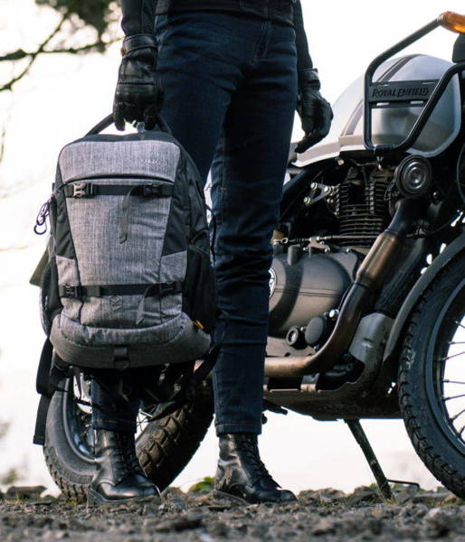 Wszystko jest w pełni regulowane. Regulacja obejmuje również paski w talii i na klatce piersiowej, które zostały zaprojektowane tak, aby plecak był wygodny do noszenia, a także bezpieczny podczas jazdy na motocyklu. Poza motocyklem, na górze plecaka znajduje się miękki uchwyt do przenoszenia. Nawet szary materiał został zaprojektowany tak, aby dobrze znosić zmienne warunki pogodowe!