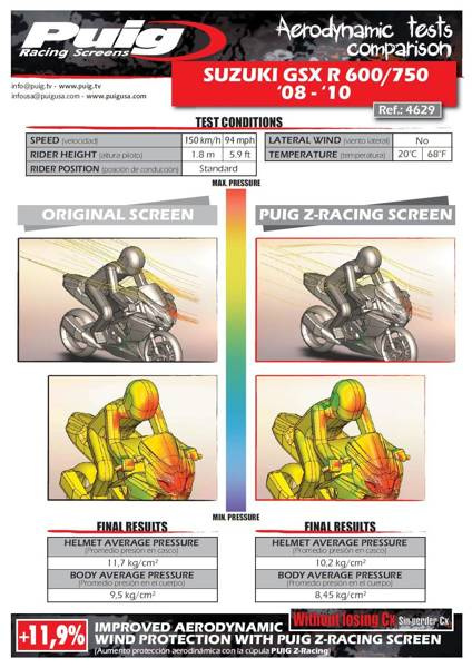 Sportowa szyba PUIG - z charakterystycznym, dodatkowym garbem w środkowej części poprawiającym aerodynamikę (double bubble, podwójny garb). Zaprojektowana w wirtualnym tunelu aerodynamicznym. Wysoka jakość optyczna (akryl). Mocowana w miejsce fabrycznej, za pomocą fabrycznych śrub. Posiada niemiecki atest TUV.