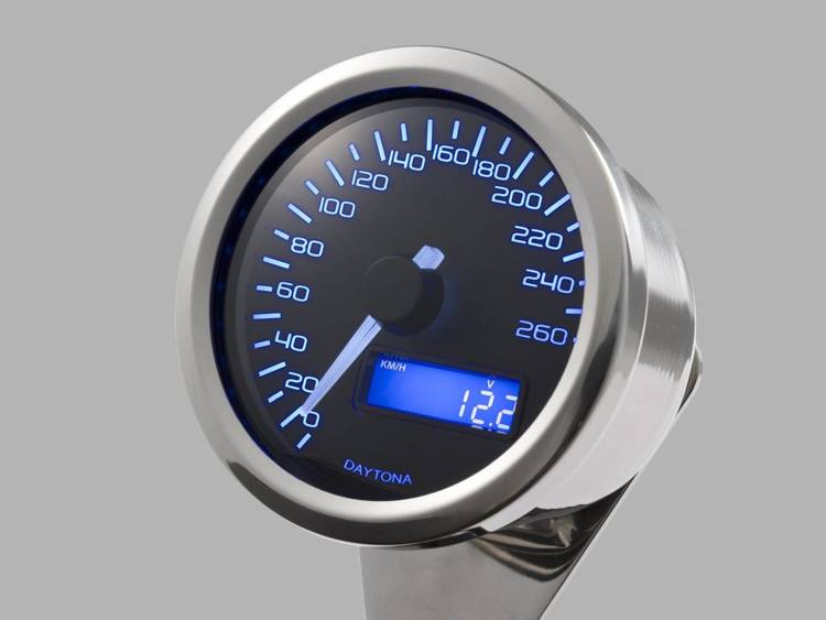 Daytona VELONA 60 Speedometer black 260 Km/h / MPH. Stepping motor driven speedometer with accurate speed display Diameter: ? 60mm x Depth 42,5mm Polished stainless steel housing Black scale with white LED backlight Up to 260 Km/h or 260 MPH ODO: 0-99.999 km/miles Double trip counter: 0-99.999 km/miles V-shaped bracket included DC-power: 0-18V (normal 12V) E-marked If the bike has a standard electronic signal for speed, this speedometer can be connected to this original electronic impulse. If the bike is not equipped with a standard electronic signal for speed, please use the active Daytona sensor (#87038).