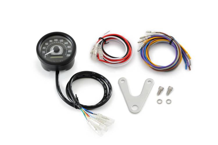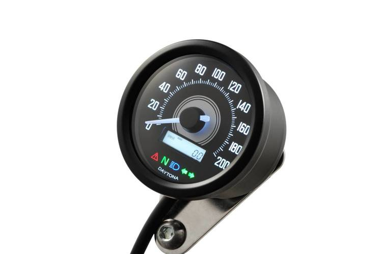 Daytona VELONA 60 Speedometer black 200 Km/h / MPH with indicators. Stepping motor driven speedometer with accurate speed display Diameter: ? 60mm x Depth 42,5mm Black stainless steel housing Black scale with white LED backlight Up to 200 Km/h or 200 MPH ODO: 0-99.999 km/miles Double trip counter: 0-99.999 km/miles V-shaped bracket included DC-power: 0-18V (normal 12V) E-marked If the bike has a standard electronic signal for speed, this speedometer can be connected to this original electronic impulse. If the bike is not equipped with a standard electronic signal for speed, please use the active Daytona sensor (#87038).