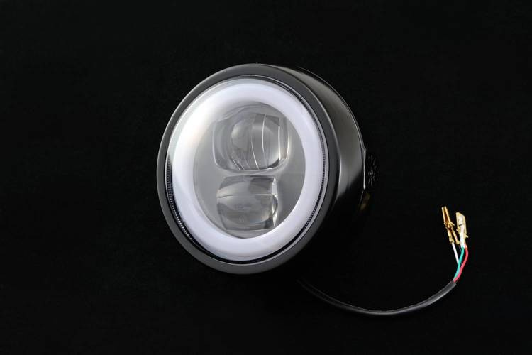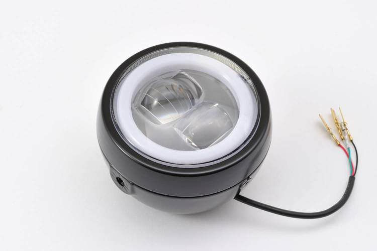 LED HEADLIGHT"CAPSULE120" SIDE-MOUNT, CHROME Small approved 120mm LED headlight with tight metal housing and side mounting left and right. E-marked position- and parkinglight (angel eye), drivinglight and high beam. Highly vibration- and waterresistant headlight which may be used for caferacers, enduros and all other bikes.