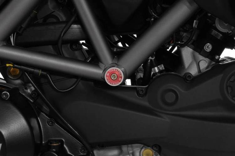 These small but fine accessories close off the open tube ends at the joints on the Ducati Multistrada’s lattice frame. Each made from a single piece of solid aluminium, the plugs are secured into the frame tube by a precisely fitting clamp. The specially made, colour anodised end caps on the plugs are interchangeable and lend an elegant touch that enhances the sporty appearance of your Multistrada.
