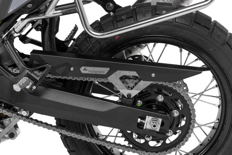 Touratech’s chain guard for the Tenere 700. Much sturdier than the original plastic part, the Touratech chain guard is made from stainless steel and aluminium yet is still relatively light. Visually the metal chain guard fits much better with the overall concept of a touring enduro like the Tenere 700. The chain guard is simple and quick to fit as it attaches to the existing mounting points.