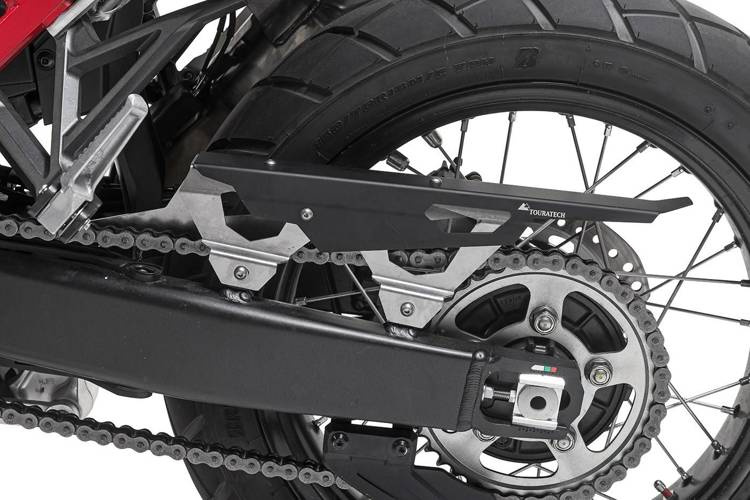 Touratech’s chain guard for the Africa Twin. Much sturdier than the original plastic part, the Touratech chain guard is made from stainless steel and aluminium yet is still relatively light. Visually the metal chain guard fits much better with the overall concept of a touring enduro like the CRF1100L. The chain guard is simple and quick to fit as it attaches to the existing mounting points.The chain guard can be adjusted in length.