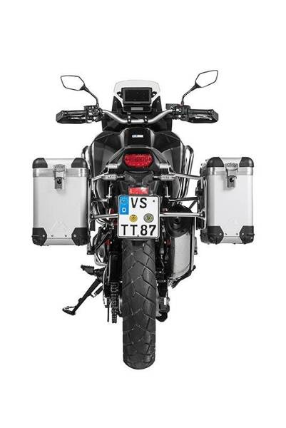 The aluminium pannier system again has a very robust construction. We have tried to bring the pannier racks and the panniers as close as possible to the motorcycle. Numerous tests have already been performed in order to ensure that the entire development satisfies the required demands. The rack is made of 18 mm steel tubing and is attached to existing mounting points using special fixing clips and reinforcing pieces. Pillion comfort not restricted in any way. Enhances the enduro and touring - ready fitted fixing kits- sturdy connecting bar- original indicators can be re-used- Stainless steel rackPannier system:Robust stainless steel pannier frame made from 18 mm diameter steel tube with a 2 mm thick wall. Bolted crosspiece for better rigidity. Mounting easy to fit. Uses standard mounting points. No modifications to rear footrests. Mounting bolts are included.ZEGA Pro:In a modern design and state-of-the-art construction, our developers have come up with a veritable masterpiece in the ZEGA Pro.Light and yet sturdy, the case is available in a 31/38 litre version, made entirely of 1.5-mm aluminium, water- and dust-proof, and manufactured to the highest standards - no way were we going to settle for a basic plastic construction that was simply jazzed up with a few bits of moulded aluminium!The lid and base of the ZEGA Pro are welded, which achieves the maximum rigidity of the connections, and the base and outer shell have high quality rivets (no cheap studs for us - or you!). You'll find no leaky welded seams along the edges. High quality silicone seals ensure that the contents of this case are protected as well as possible.The highly robust protective strip along the car case is screwed on, and so is easily replaced when necessary - perhaps after a fall. The same applies to the strong protective corners on the lid, which comes off completely or can be opened just from one side - the catches double as hinges.The ZEGA Pro appeals not only for its technology and workmanship, but also for the many clever detail solutions and the modern protected design - the rounded lines of the item really do catch the eye. Thus, for instance, a clever handle can be added to the lid. The four attachment eyes rise only slightly above the surface of the case, so it also makes an ideal seat.Some of the other benefits of the ZEGA Pro are that it is easy to open to retrieve a luggage roll and our extensive range of accessories. The clever touches of the ZEGA Pro include the ingenious lock system, which is strong and reliable yet easy to operate.The advantages at a glance:- automatic locking prevents the catches from opening accidentally- fitted locks can be replaced or added later without drilling or filing- simultaneously locking fitted locks are available at no extra charge; also available with simultaneous locking with navigation brackets and oil plugs.