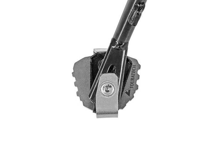 To znany problem, który wystawił na próbę temperament wielu motocyklistów. Po jeździe motocyklem po kamienistych, wyboistych trasach  chcesz po prostu zatrzymać się na odpoczynek. Ale łatwiej powiedzieć niż to zrobić. Zaparkowanie motocykla na miękkim podłożu może być prawdziwym problemem! Zazwyczaj nie możesz znaleźć drewnianej deski lub czegoś podobnego, na czym mógłbyś postawić motocykl, gdy tego potrzebujesz.Touratech ma rozwiązanie: poszerzenie podstawy podpórki bocznej ponad dwukrotnie zwiększa powierzchnię podparcia, więc nie będziesz musiał się męczyć z podnoszeniem w pełni obciążonej maszyny. Mieszanka stali nierdzewnej i anodowanego na czarno aluminium zapewnia estetyczny wygląd i pełną stabilność. Bezpiecznie przymocowane poszerzenie do stopki bocznej przydatnym akcesorium, które zawsze jest pod ręką, aby zaoszczędzić Ci wiele kłopotów i frustracji.