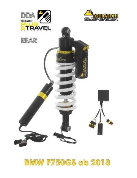 This Touratech Suspension DDA / Plug & Travel shock absorber is an absolutely top class suspension component for your BMW F750GS equipped with the BMW DDC system. This premium shock absorber is systematically designed for long-distance touring with lots of luggage, on any type of road surface and even off-road. This Touratech Suspension DDA / Plug & Travel shock absorber simply replaces the BMW DDC shock. The existing plug connectors and switches on the handlebar are retained and used as usual. As a result, this shock absorber becomes an integral part of the motorcycle via the original BMW control unit. This shock absorber can be used together with the original BMW front shock absorber. The Touratech suspension system that adapts itself to the adventurer inside you so all you have to do is ride!This Touratech Suspension DDA / Plug & Travel shock absorber is manufactured using the same precision components and parts that have been tried-and-tested in our shock absorbers over thousands of miles of touring, under the most intense conditions. At the heart of this shock absorber is the high-performance DDA valve, developed and patented by Tractive. It allows the damping to adjust in fractions of a second to any riding situation. To withstand the rigours of long-distance touring, our shock absorbers have a larger piston diameter, which means a larger oil capacity. This enables better cooling with a high damping frequency. As a result, the shock absorber and damping are more stable and there is less stress on the seals. Important, please note: - With this suspension solution, we recommend replacing the rear and front suspension together.- This is the only way to achieve the best possible handling with this premium suspension system.What's included:- Touratech Suspension DDA Plug & Travel "rear" shock absorber- Ready to fit with plug connector and wiringThe basic setup fitted here is designed for riders up to 100 kg including luggage. Modifications are possible for a heavier rider (more than 100 kg) and/or if the bike is usually ridden with a passenger / with luggage. In this case, we individually modify the shock absorber to meet your needs by fitting a spring with a higher spring rate. If you have any further questions, we will be happy to advise you. Contact us.