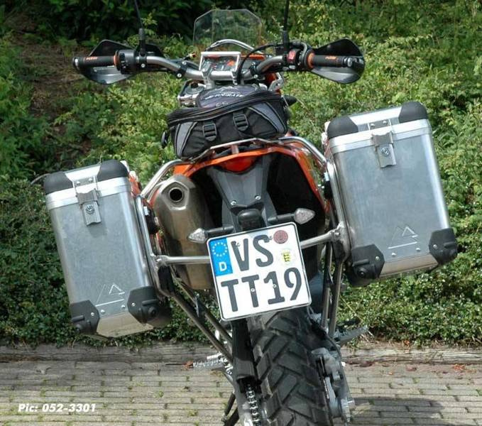 The aluminium pannier system again has a very robust construction. We have tried to bring the pannier racks and the panniers as close as possible to the motorcycle. Numerous tests have already been performed in order to ensure that the entire development satisfies the required demands.The rack is made of 18 mm steel tubing and is attached to existing mounting points using special fixing clips and reinforcing pieces.The anodised version of the ZEGA Pro doesn't just shine in its fabulous natural aluminium look, but also prevents rubbing inside the case. The ultra thick, high quality anodised layer offers very special protection for the surface and helps to prevent discoloration.- ready fitted fixing kits- sturdy connecting bar- original indicators can be re-used- Stainless steel rackPannier system:Robust stainless steel pannier frame made from 18 mm diameter steel tube with a 2 mm thick wall. Bolted crosspiece for better rigidity. Mounting easy to fit. Uses standard mounting points. No modifications to rear footrests. Mounting bolts are included.ZEGA Pro:In a modern design and state-of-the-art construction, our developers have come up with a veritable masterpiece in the ZEGA Pro.Light and yet sturdy, the case is available in a 31/38 litres version, made entirely of 1.5-mm aluminium, water- and dust-proof, and manufactured to the highest standards - no way were we going to settle for a basic plastic construction that was simply jazzed up with a few bits of moulded aluminium!The lid and base of the ZEGA Pro are welded, which achieves the maximum rigidity of the connections, and the base and outer shell have high quality rivets (no cheap studs for us - or you!). You'll find no leaky welded seams along the edges. High quality silicone seals ensure that the contents of this case are protected as well as possible.The highly robust protective strip along the car case is screwed on, and so is easily replaced when necessary - perhaps after a fall. The same applies to the strong protective corners on the lid, which comes off completely or can be opened just from one side - the catches double as hinges.The ZEGA Pro appeals not only for its technology and workmanship, but also for the many clever detail solutions and the modern protected design - the rounded lines of the item really do catch the eye. Thus, for instance, a clever handle can be added to the lid. The four attachment eyes rise only slightly above the surface of the case, so it also makes an ideal seat.Some of the other benefits of the ZEGA Pro are that it is easy to open to retrieve a luggage roll and our extensive range of accessories. The clever touches of the ZEGA Pro include the ingenious lock system, which is strong and reliable yet easy to operate.The advantages at a glance:- automatic locking prevents the catches from opening accidentally- fitted locks can be replaced or added later without drilling or filing- simultaneously locking fitted locks are available at no extra charge; also available with simultaneous locking with navigation brackets and oil plugs.