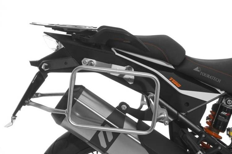 Solidny stelaż wykonany jest z 18 mm rurki ze stali nierdzewnej. Za pomocą specjalnych klipsów mocujących, stelaż mocuje się do tylnej części bagażnika i istniejących punktów montażowych. Bardzo wytrzymała konstrukcja z poprzeczką, która radzi sobie również w trudnych warunkach terenowych, a jednocześnie elegancko pasuje do ogólnego wyglądu KTM 1190 ADV/R.Pasuje również do KTM Super Adventure S, R, T (od 2017)