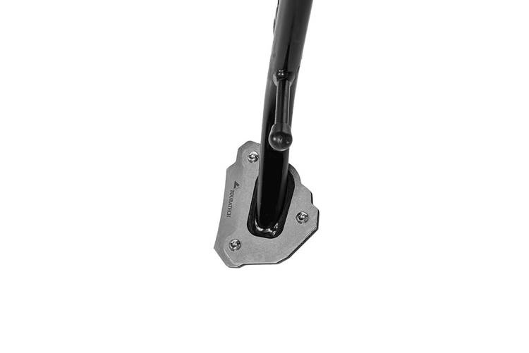 To znany problem, który wystawił na próbę temperament wielu motocyklistów. Po jeździe motocyklem po kamienistych, wyboistych trasach chcesz po prostu zatrzymać się na odpoczynek. Ale łatwiej powiedzieć niż to zrobić. Zaparkowanie motocykla na miękkim podłożu może być prawdziwym problemem! Zazwyczaj nie możesz znaleźć drewnianej deski lub czegoś podobnego, na czym mógłbyś postawić motocykl, gdy tego potrzebujesz.Touratech ma rozwiązanie: poszerzenie podstawy podpórki bocznej ponad dwukrotnie zwiększa powierzchnię podparcia, więc nie będziesz musiał się męczyć z podnoszeniem w pełni obciążonej maszyny. Mieszanka stali nierdzewnej i anodowanego na czarno aluminium zapewnia estetyczny wygląd i pełną stabilność. Bezpiecznie przymocowane poszerzenie do stopki bocznej przydatnym akcesorium, które zawsze jest pod ręką, aby zaoszczędzić Ci wiele kłopotów i frustracji.Nie pasuje do motocykli z obniżonym zawieszeniem!