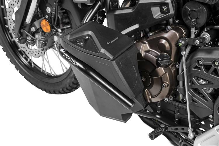 Praktyczna skrzynka narzędziowa jest solidnie przykręcona do specjalnie opracowanych gmoli dolnych w pobliżu silnika, dzięki czemu środek ciężkości pozostaje nisko. Wykonana z odpornego na uderzenia tworzywa ABS, ma niewielką wagę i dużą pojemność. Jej pojemność wynosi około 3,5 litra - wystarczająco dużo, aby pomieścić zesyaw narzędzi, apteczkę lub zestaw naprawczy do opon. Duży otwór, który umożliwia łatwy załadunek, zamykany jest zdejmowaną wodoodporną pokrywą.Nie masz jeszcze gmoli dolnych Touratech? Nie ma problemu, zamów cały komplet gmoli z zamontowaną skrzynką narzędziową (632-5165/632-5167)Zakres dostawy:- Skrzynka narzędziowa- Lewy gmol dolny czarny z zamontowaną skrzynką- Zestaw montażowy